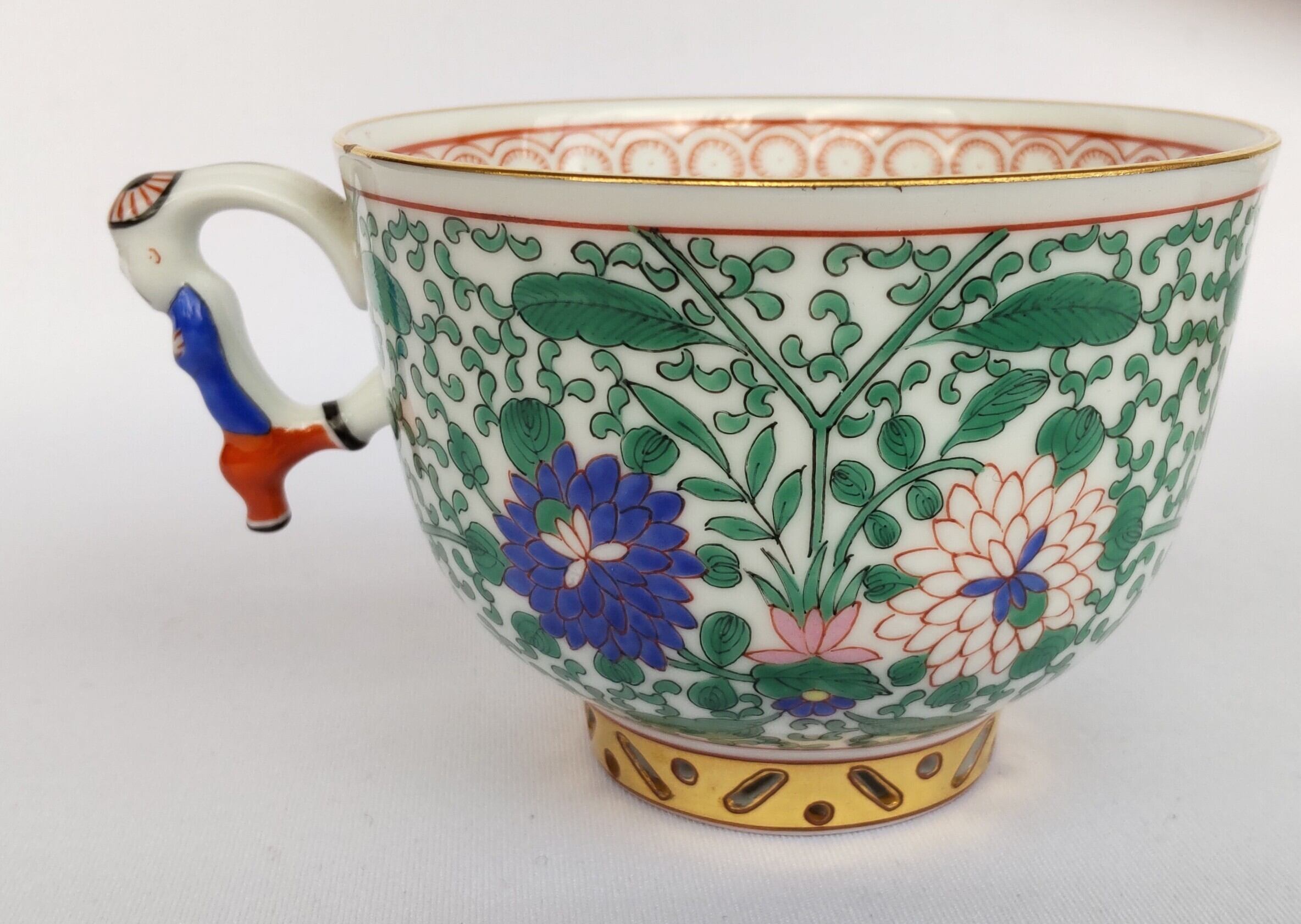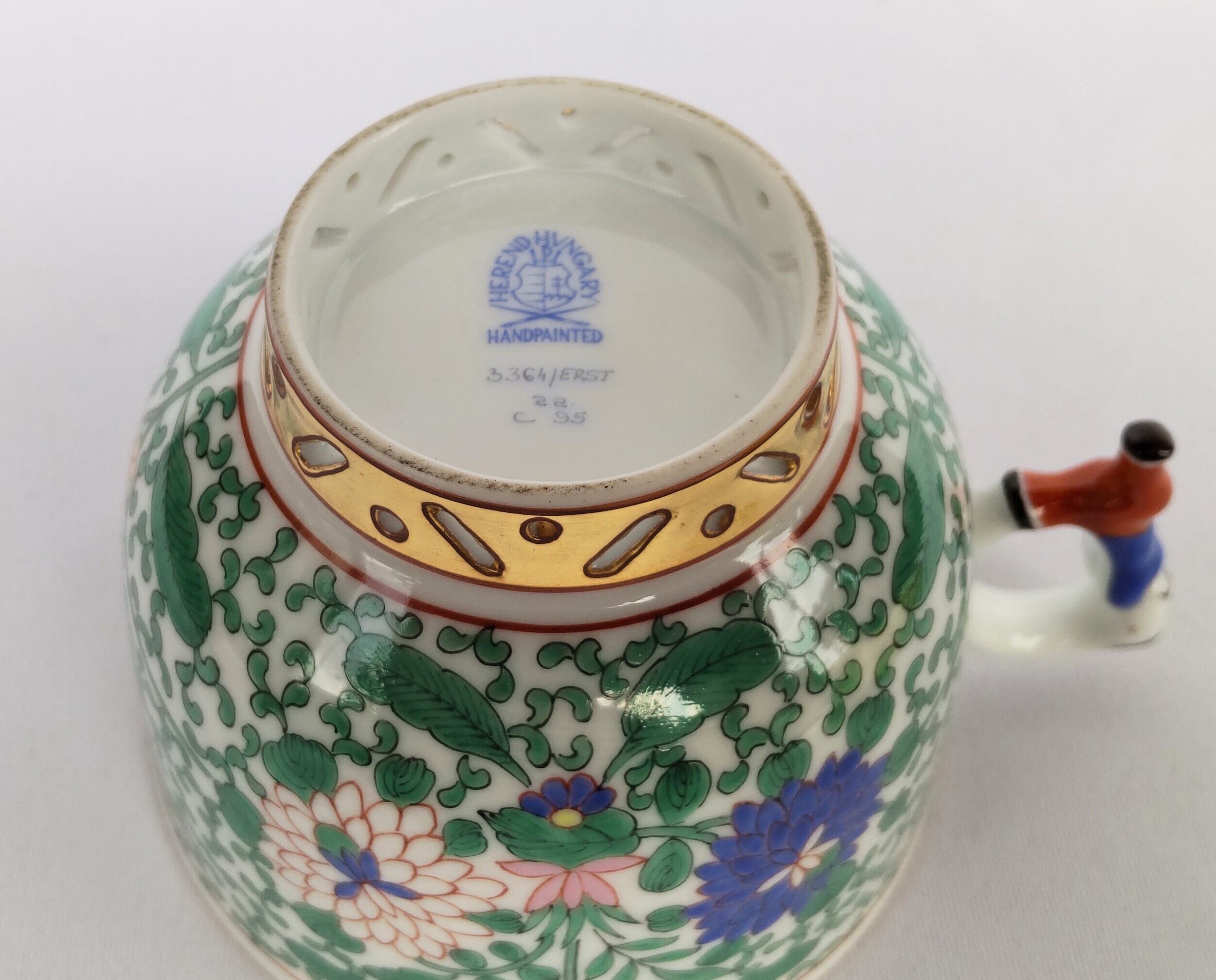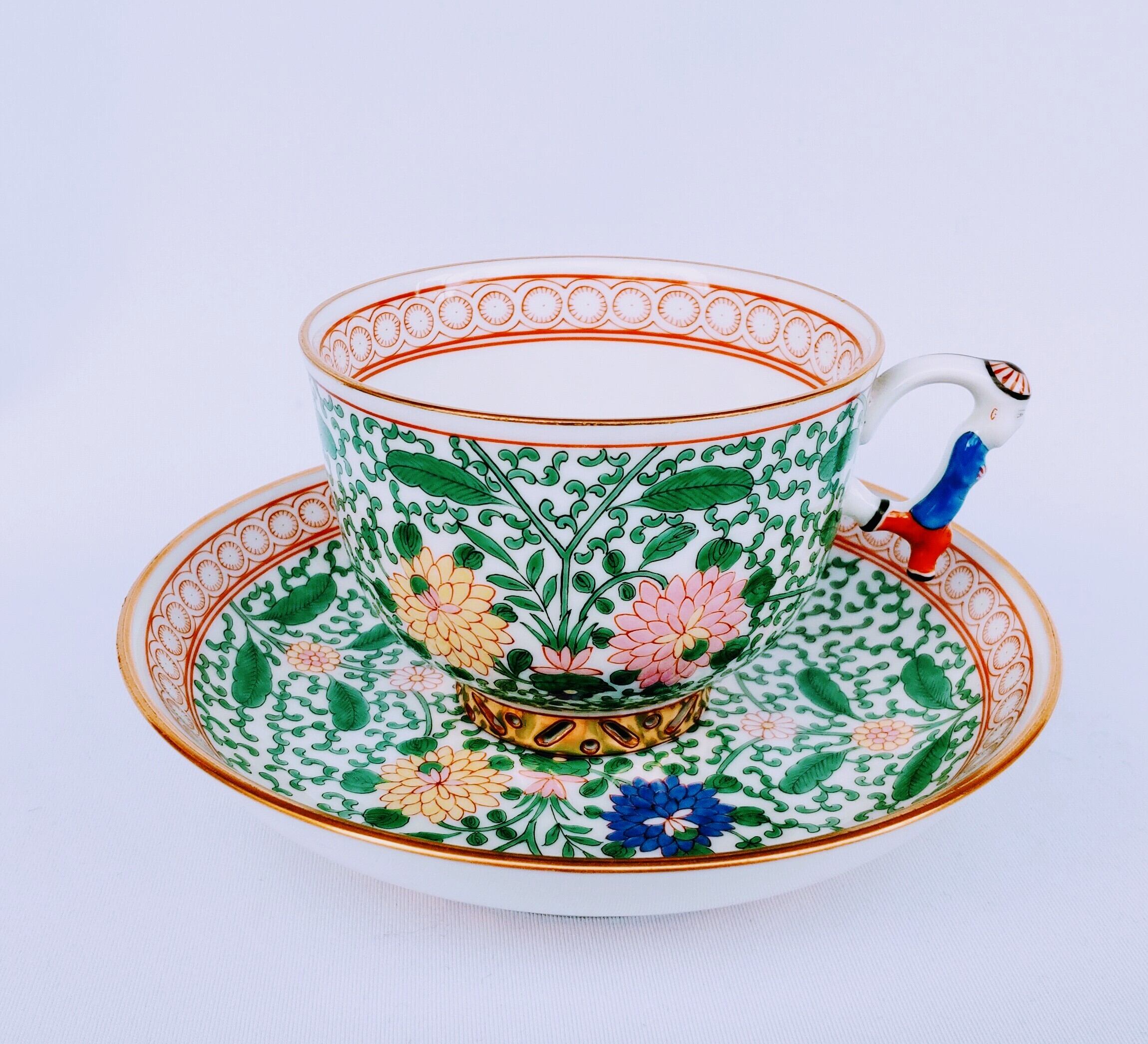 ヘレンドならではの表現と細かい技を駆使して作りだされた、中国趣味ラージカップ&ソーサーのシリーズです。金彩をあしらった高台の繊細な透かし彫り、ヘレンドのあらゆる技術が惜しみなく施された逸品です。ハンドペイントによる繊細な描き込みと色使い、取っ手に付いたマンダリン(明の官吏)が非常にユニークな希少品です。